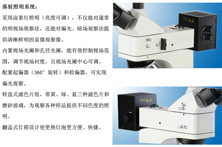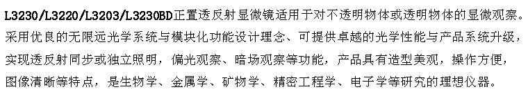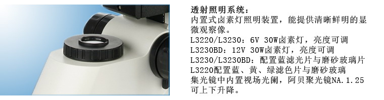 技術規格目鏡大視野 WF10X(視場數Φ22mm)無限遠平場消色差物鏡L3203/L3220/L3230(配明場物鏡)PL L5X/0.12 工作距離:26.1 mmPL L10X/0.25 工作距離:20.2 mmPL L40X/0.60 工作距離:3.98 mmPL L60X/0.70 工作距離:2.03 mmL3230BD(配明/暗場物鏡)PL L5X/0.12 BD 工作距離:8.05 mmPL L10X/0.25 BD 工作距離:7.86 mmPL L20X/0.40 BD 工作距離:7.2 mmPL L40X/0.60 BD 工作距離:3.0 mm目鏡筒30?傾斜,瞳距調節范圍53~75mm.調焦機構粗微動同軸調焦,帶鎖緊和限位裝置,微動格值:2μm.轉換器五孔(內向式滾珠內定位)載物臺雙層機械移動式載物臺, 外形尺寸:210mmX140mm,移動范圍:63mmX50mm落射照明系統L3203/L3220/L323012V30W鹵素燈,亮度可調L3230BD12V50W鹵素燈,亮度可調L3203/L3230/L3230BD配置黃、藍、綠濾色片與磨砂玻璃片L3220配置黃、藍、綠、紅濾色片內置視場光欄、孔徑光欄、濾色片轉換裝置、推拉式檢偏器與起偏器透射照明系統阿貝聚光鏡NA.1.25可上下升降集光鏡中內置視場光欄L3230/L3230BD配置藍濾色片與磨砂玻璃片L3220配置藍、黃、綠濾色片與磨砂玻璃片L3220/L323012V30W鹵素燈、亮度可調L3230BD12V30W鹵素燈,亮度可調