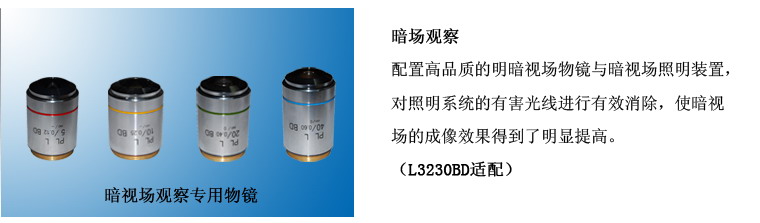 可選配件選配件目鏡分劃目鏡10X(Φ22mm)物鏡L3203/3220/3230明場物鏡 20X、50X、80X、100X(干式)L3230BD明/暗場物鏡 50X、60X、80X、100XCCD接頭0.5X、1X、0.5X帶分劃尺攝像儀USB輸出:130/300/500/1000萬像素數碼相機接頭CANON(EF) NIKON(F)
