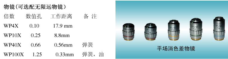 名稱 類別/技術參數 編號目鏡 大視野 WF16X(Φ11mm) 1051016分劃 10X(Φ20mm) 格值0.1mm/格 1120010目鏡筒 三目鏡(傾斜30?) 012005濾色片 綠濾色片 115002黃濾色片 115003聚光鏡 暗場 干式 051001濕式 051002相襯裝置 目鏡 對中望遠鏡 110001物鏡 相襯平場消色差 10X/0.25 PHP 2420110相襯平場消色差 20X/0.40 PHP(彈簧) 2420120相襯平場消色差 40X/0.65 PHP(彈簧) 2420140相襯平場消色差 100X/1.25 PHP(彈簧,油) 2420111轉盤式相襯聚光鏡(PH-Ⅰ) 052001轉盤式相襯聚光鏡(PH-Ⅱ) 052004插板式相襯聚光鏡 052002拉板式相襯聚光鏡 052003無限遠光學系統 目鏡筒 雙目鏡(傾斜30?) 011103三目鏡(傾斜30?) 012103目鏡 對中望遠鏡 110002物鏡 無限遠平場消色差 4X/0.10 2060104無限遠平場消色差 10X/0.25 2060110無限遠平場消色差 20X/0.40 2060120無限遠平場消色差 40X/0.65(彈簧) 2060140無限遠平場消色差 100X/1.25(彈簧,油) 2060111無限遠相襯平場消色差 10X/0.25 PHP 2470110無限遠相襯平場消色差 20X/0.40 PHP 2470120無限遠相襯平場消色差 40X/0.65 PHP(彈簧) 2470140無限遠相襯平場消色差 100X/1.25 PHP(彈簧,油) 2470111CCD接頭 0.4X 8100010.5X 8100041X 8100020.5X帶分劃尺,格值0.1mm/格 810003攝像儀 DV-1(帶USB和Video輸出) 800001DV-2(帶USB輸出) 800003DV-3(帶Video輸出) 800005數碼相機接頭 CANON數碼相機接頭(A610,A620,A630,A640) 820001攝影裝置 2.5X/4X變倍攝影裝置帶10X取景目鏡 8400014X對焦攝影裝置 840002MD卡環 840003PK卡環 840004簡易偏光系統 起偏器(可360?旋轉) 111001檢偏器 111101