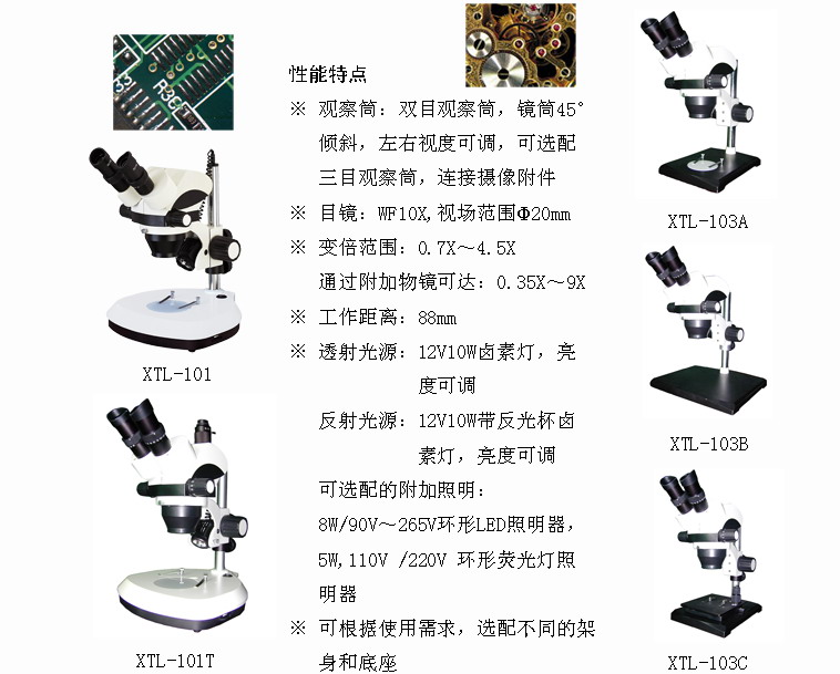 XTL-103C型號規格XTL-103AXTL-103BXTL-103C目鏡 WF10X (Φ20mm)物鏡 變倍范圍0.7X~4.5X總放大倍數 7X~45X視場 Φ28.5~Φ4.5工作距離 88mm垂直有效行程 35mm<=h<265mm35mm<=h<265mm35mm<=h<240mm底座尺寸 240X180X25(mm)300X240X25mm240X180X25(mm)帶移動工作臺,臺面移動距離42mmX42mm
